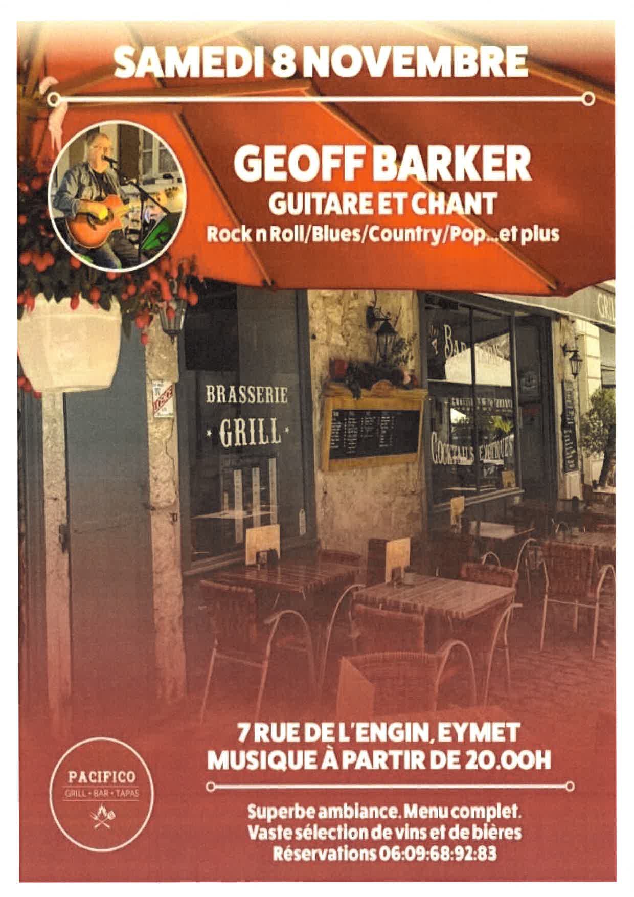 Concert de Geoff Barker dans une ambiance familiale à l'étage du Pacifico. Venez écouter du rock'n roll, blues, country, pop... et bien plus !