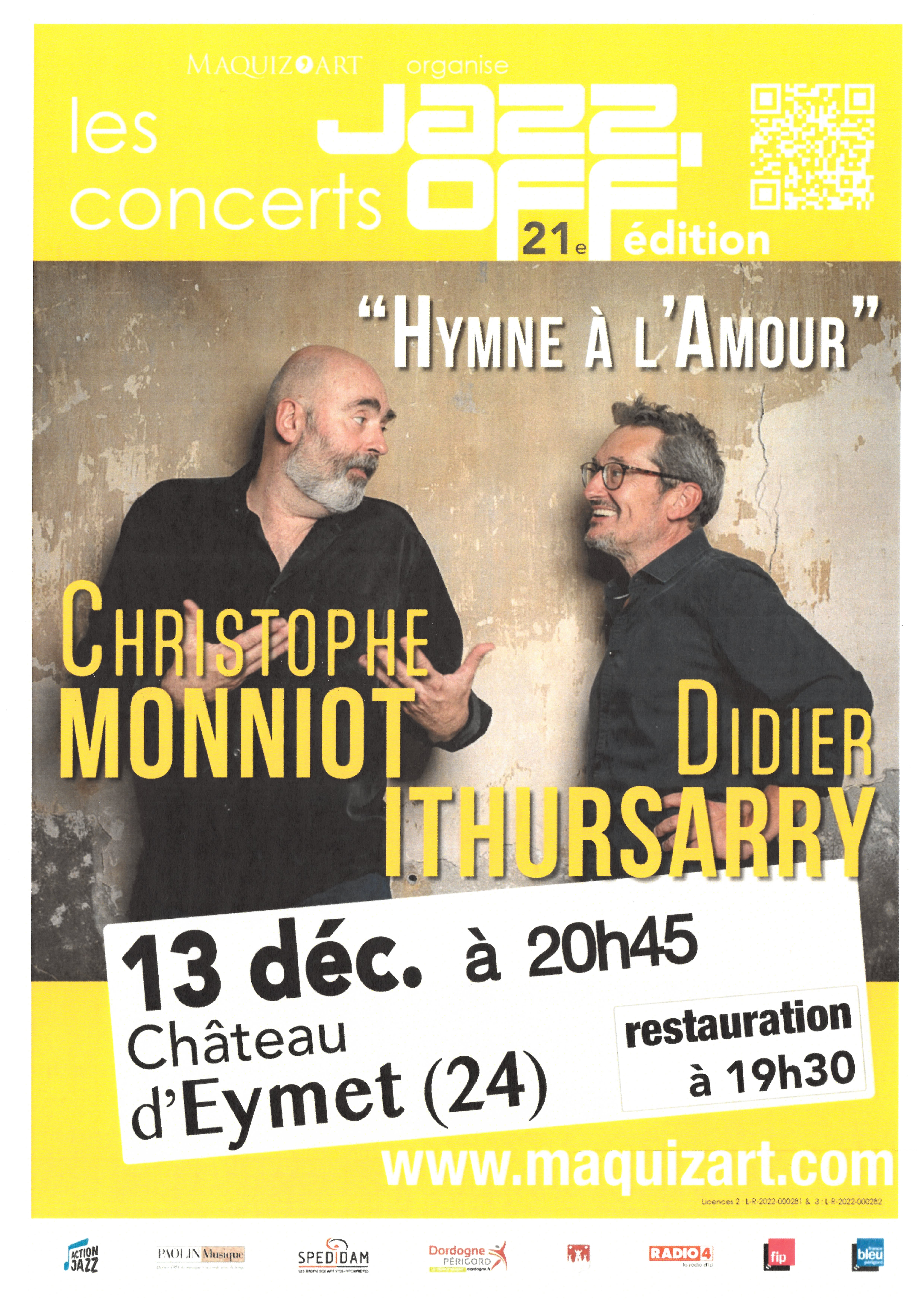 Saxophoniste normand au lyrisme à la fois épidermique et lunaire, avec l'humour décalé et la sensibilité qu'on lui connait, Christophe Monniot rencontre le merveilleux accordéoniste basque Didier Ithursarry, pour un duo tendre et haut en couleur. Tous les deux y développent, dans une luxuriante forêt acoustique, la liberté et la pulsation du jazz, l'énergie et la joie des musiques populaires, la sophistication formelle du domaine contemporain. Les deux musiciens très complices, inventifs et jubilatoires ont déjà sorti deux CD d'Hymne à l'Amour sur le label Emouvance.