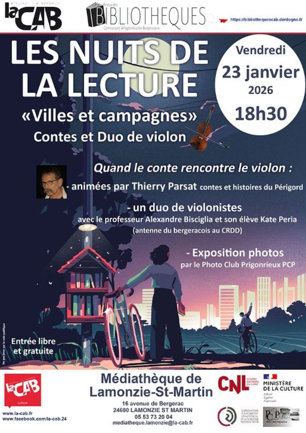 À l’occasion de l’évènement « des Nuits de la lecture », la soirée sera animée par Monsieur Thierry Parsat avec des contes et histoires du Périgord » et l’antenne du bergeracois au CRDD (Conservatoire à Rayonnement Départemental de la Dordogne) avec un duo de violonistes : le professeur Alexandre Bisciglia et son élève Kate Peria sur des interprétations liées au thème national 2026 « Villes et campagnes ».