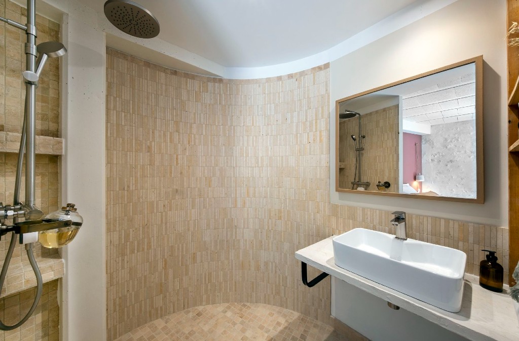 Imagined as an old village house, it features a living room with whitewashed walls and a fully-equipped kitchen for convivial moments with friends or family.