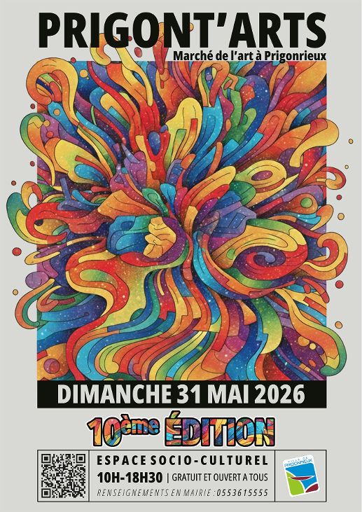 La Ville de Prigonrieux prépare la 10ᵉ édition de Prigont’Arts, rendez-vous dédié à la création locale, qui se tiendra le dimanche 31 mai 2026 à l’Espace socio-culturel, ainsi qu’en extérieur sur le parvis.