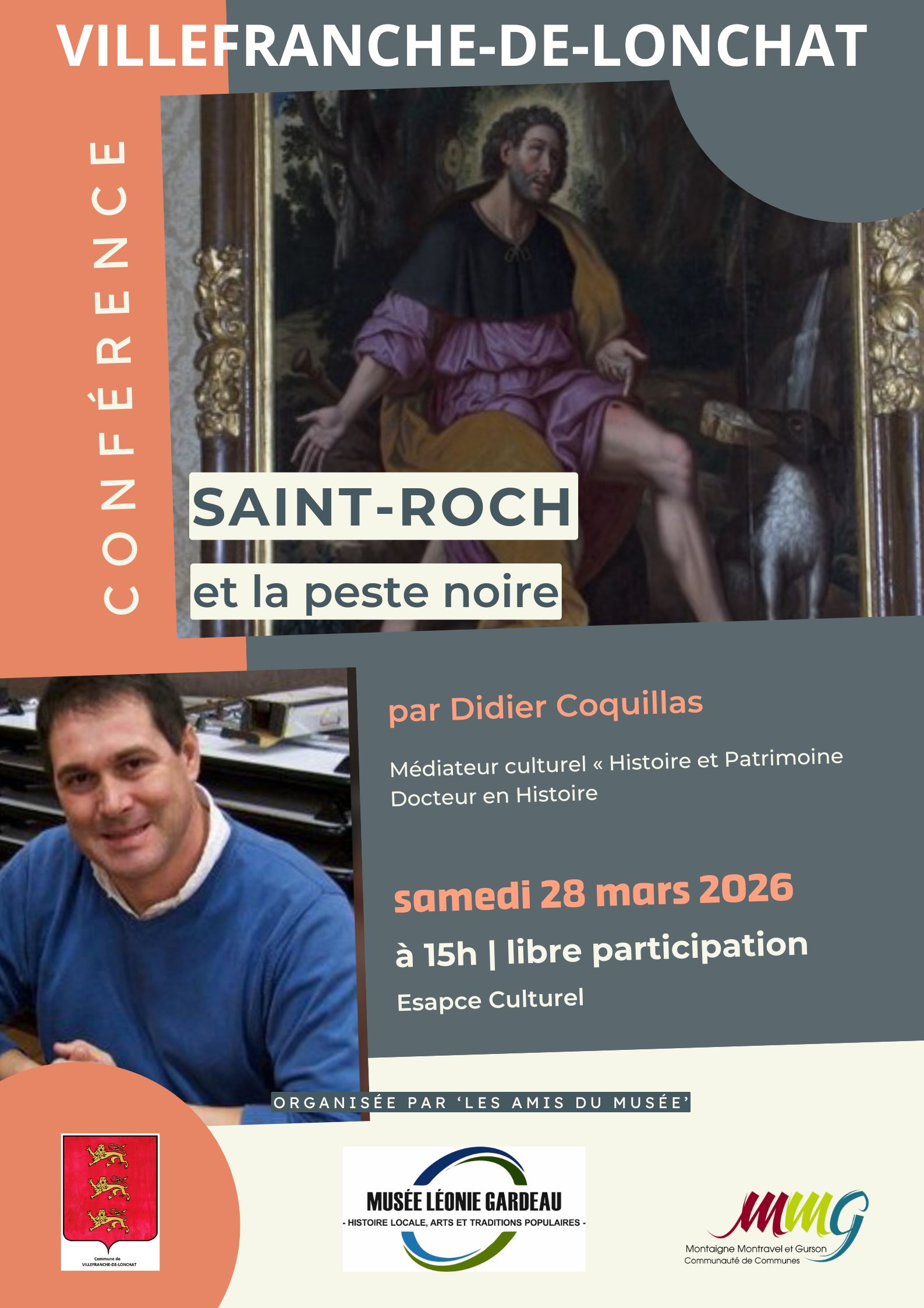 À Villefranche-de-Lonchat, laissez-vous captiver par le regard éclairé de Didier Coquillas, docteur en Histoire et spécialiste du patrimoine. À travers récits, anecdotes et analyses, il vous fera revivre une époque marquée par les épidémies et la figure emblématique de Saint Roch, protecteur des malades.
