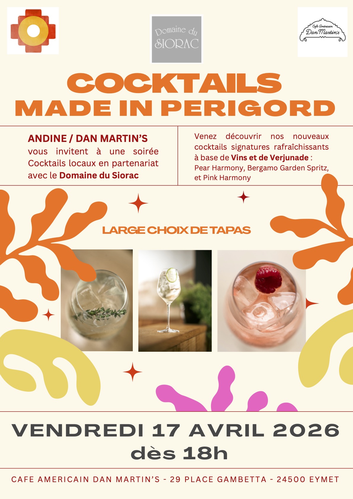 Le restaurant Andine, en partenariat avec le Dan Martin's vous proposent une soirée pour découvrir les nouveaux cocktails signatures rafraîchissants à base de vin et de verjunade, présentés par Muriel du Domaine du Siorac : Pear Harmony, Bergamo Garden Spritz et Pink Harmony, accompagnés d'un large choix de tapas.