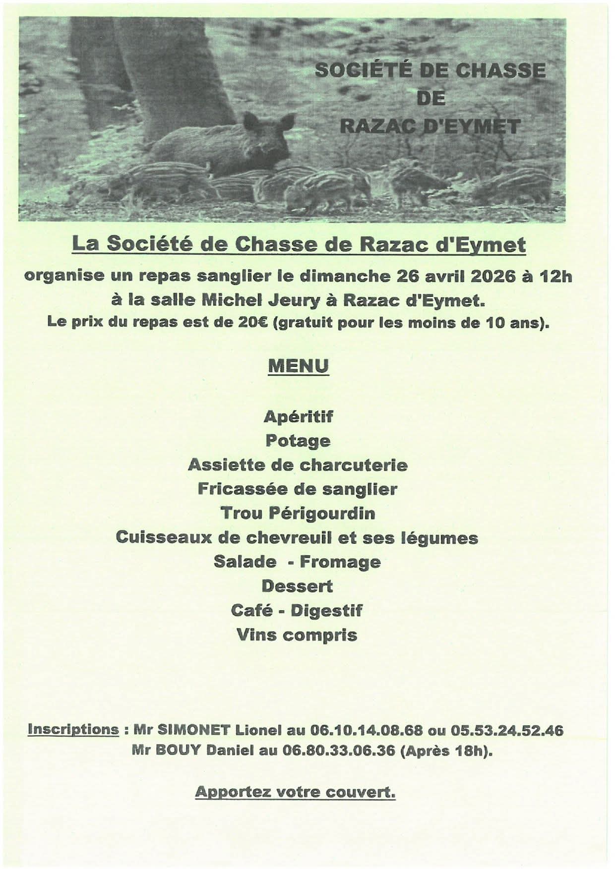 La Société de Chasse de Razac d'Eymet oranise une repas sanglier.