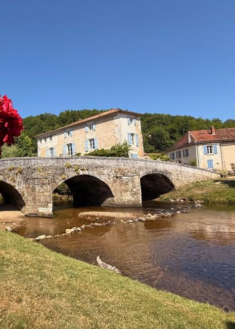 Je franchis la Côle par son élégant pont médiéval, reconnaissable à sa silhouette en dos d’âne et à ses avant-becs qui ont défié les siècles. Pavé de galets venus sans doute de la rivière, il résonne encore du passage des charrettes qui reliaient autrefois Nontron à Thiviers.