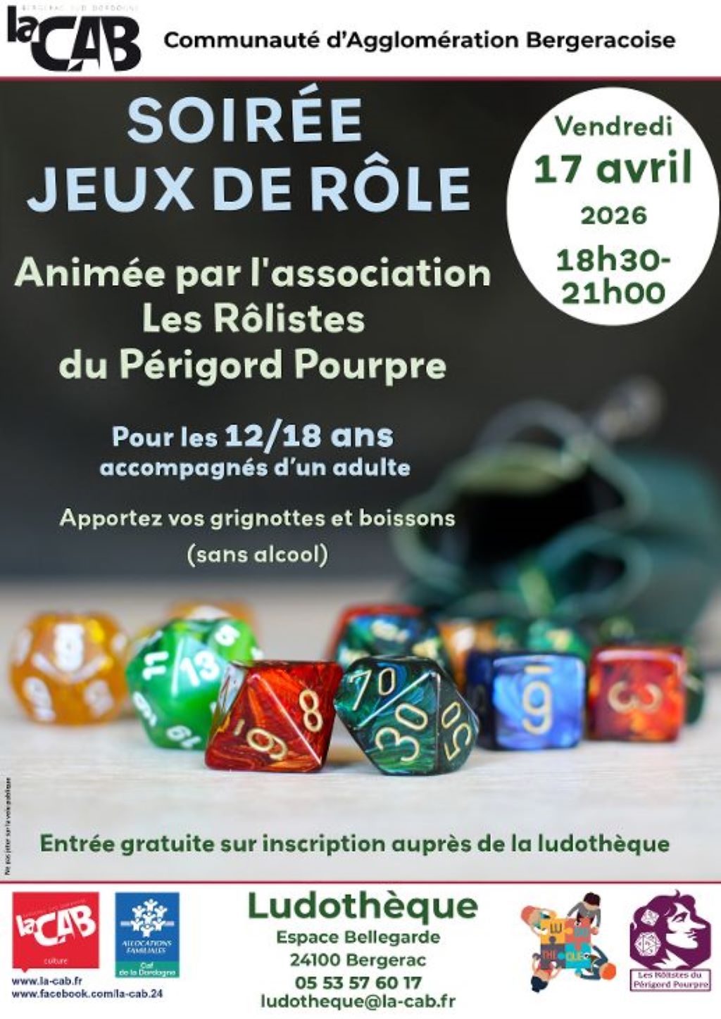 SOIRÉE JEUX DE RÔLE : Animée par l'association Les Rôlistes du Périgord Pourpre. Apportez vos grignotes et boissons (sans alcool).