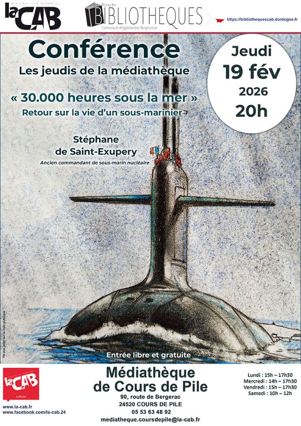 Dans le cadre des Jeudis de la médiathèque de Cours-de-Pile, Stéphane de Saint-Exupéry, ancien commandant de sous-marin nucléaire, propose une conférence intitulée « 30 000 heures sous la mer ».
