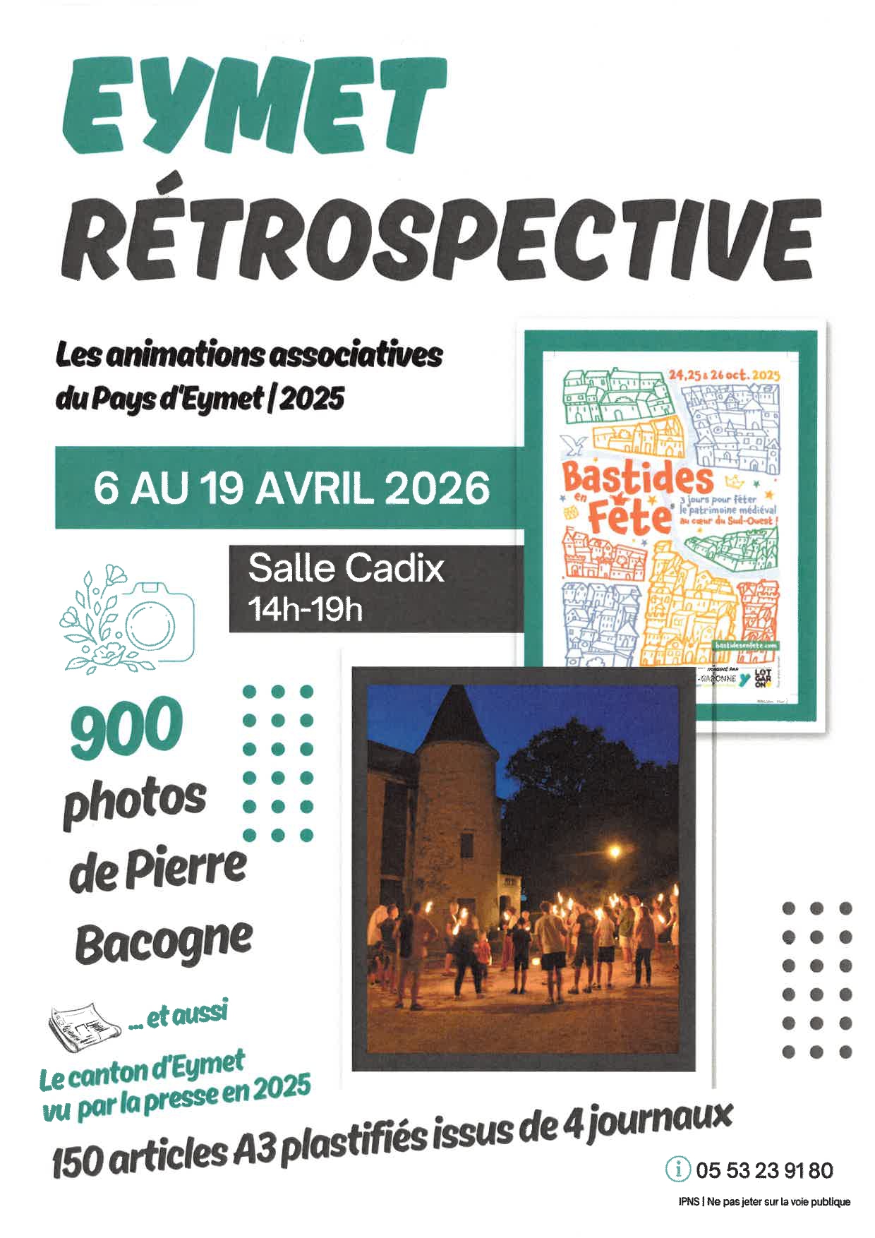 Pierre Bacogne vous propose une rétrospective des animations associatives au Pays d'Eymet de 2025 avec plus de 900 photos...et aussi le canton d'Eymet vu par la presse avec 150 articles A3 plastifiés issus de 4 journaux !