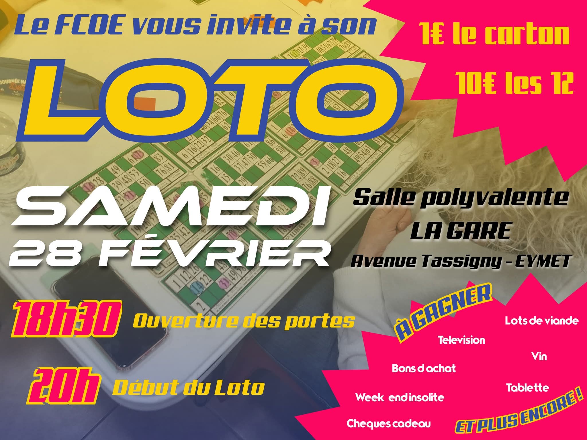 Le Football Club de l'Olympique Eymetois organise son loto avec de nombreux lots à gagner : lots de viande, télévision, vin, bons d'achat, tablette, week-end insolite, chèques cadeaux... et plus encore!!