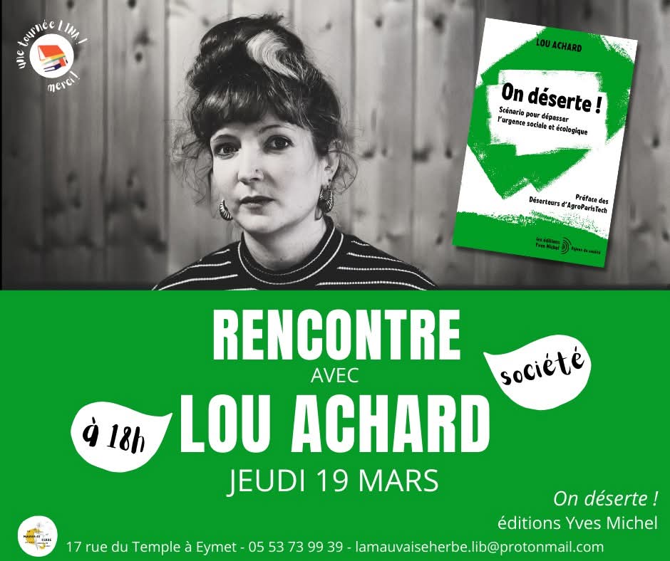 Ce qu'on en a de la chance ! Nous vous espérons tout un tas pour partager une soirée-débat passionnante avec l'essayiste, performeuse et poétesse Lou Achard à propos de son livre "On déserte" paru aux éditions Yves Michel.
