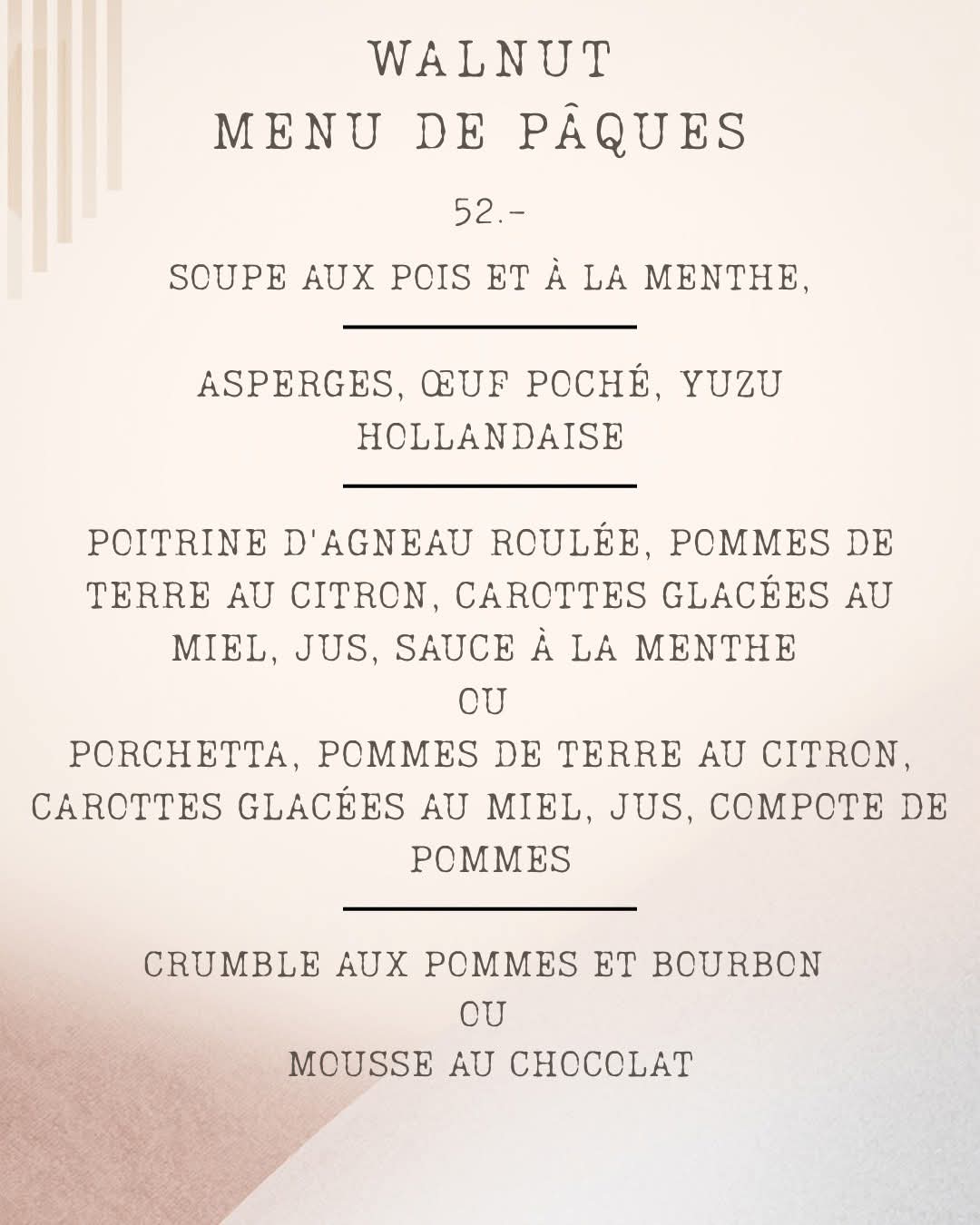 Le week-end de Pâques approche à grands pas, et nous sommes ravis que vous nous rejoigniez chez Walnut pour une célébration riche en saveurs ! N'hésitez pas à réserver votre repas spécial du dimanche de Pâques, avec vos favoris du printemps.