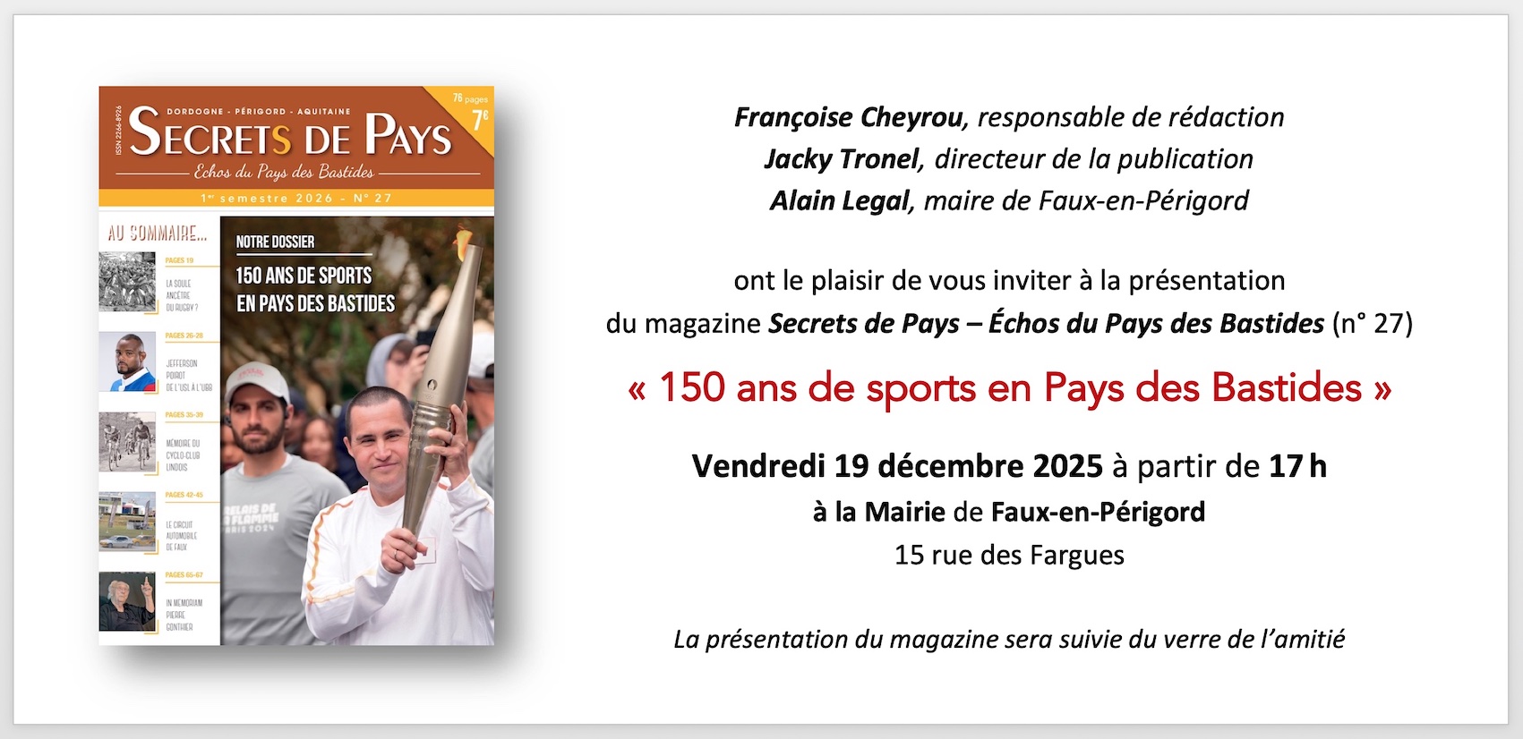 Nous avons le plaisir de vous inviter à la présentation du magazine Secrets de Pays - Échos du Pays des Bastides (n°27) qui présentera le thème "150 ans de sports en Pays de Bastides". Ce magazine contient, entre autre, un entretien avec Michel Sibra, le réalisateur du film "La Soule", lors de son passage à Issigeac en 2023.