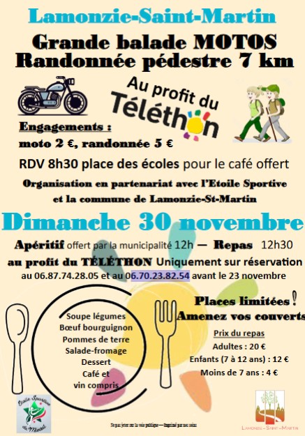 À 12h30 : Repas au profit du Téléthon (uniquement sur réservation)