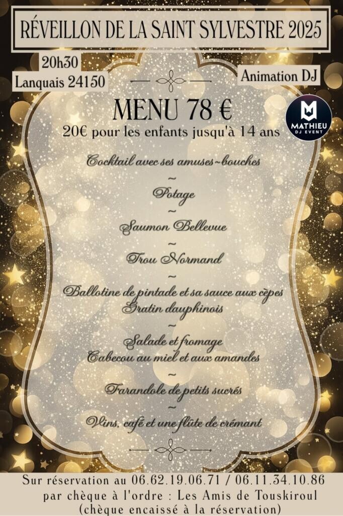 Au menu : cocktail avec ses amuse-bouche, potage, saumon Bellevue, trou normand, ballotine de pintade et sa sauce aux cèpes, gratin dauphinois, salade, cabécou au miel et aux amandes, farandole de petits sucrés, vin, café et une flûte de crémant.