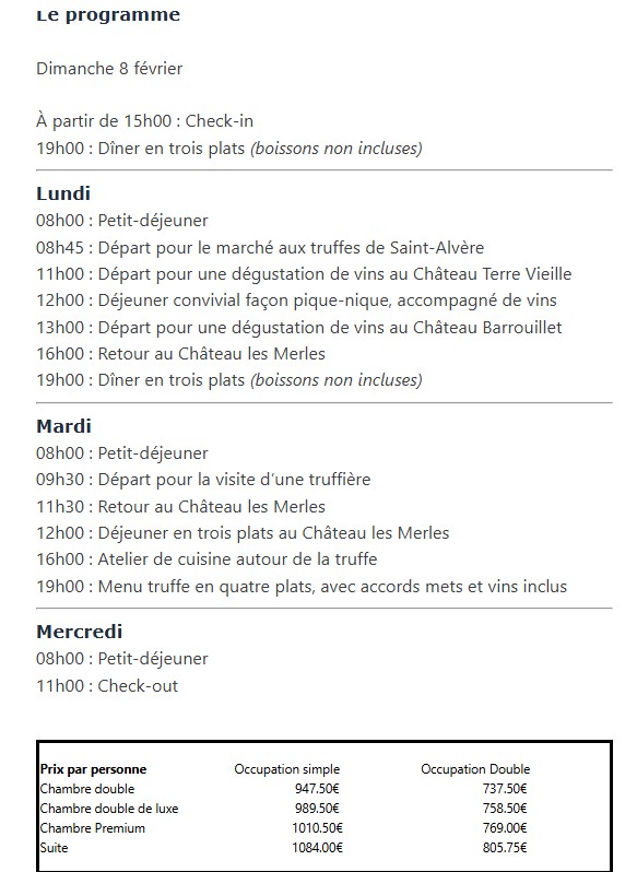 Votre séjour débute le dimanche 8 février par un accueil chaleureux, suivi d’un dîner décontracté en trois plats au Château les Merles.