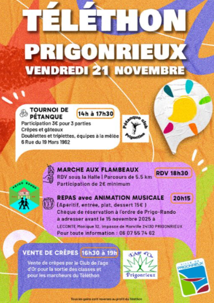 Prigonrieux se mobilise pour le Téléthon le vendredi 21 novembre avec une journée d’animations au profit de la recherche médicale. Les habitants sont invités à participer aux différentes activités proposées tout au long de la journée.
