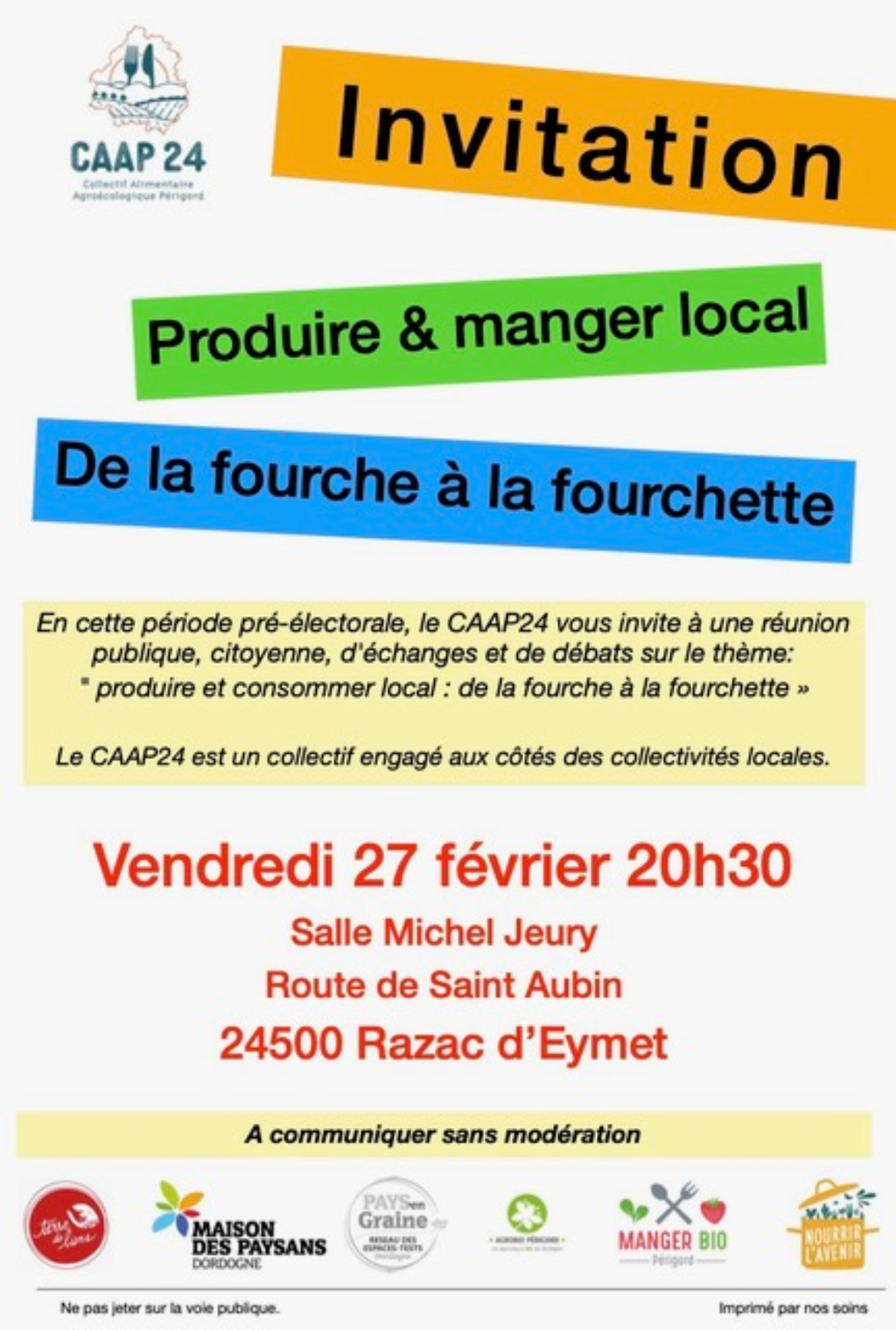 Le Collectif Alimentaire et Agroécologique du Périgord (CAAP24) organise une soirée d’échange et de débat sur les questions que nous nous posons sur notre production agricole de biens alimentaires, notre alimentation, notre santé et le développement du territoire. En Dordogne et dans notre communauté de communes, des actions ont été mises en place au Collège et dans les cantines scolaires.