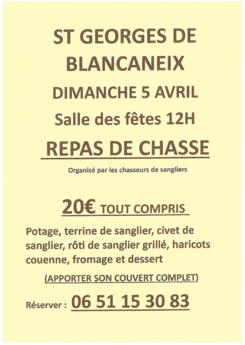 La commune de Saint-Georges-de-Blancaneix vous invite à partager un moment convivial autour d’un traditionnel repas de chasse, organisé par les chasseurs de sangliers. Rendez-vous le dimanche 5 avril à 12h, à la salle des fêtes, pour déguster un menu généreux mettant à l’honneur les saveurs du terroir : potage, terrine de sanglier, civet, rôti grillé, accompagnements, fromage et dessert.