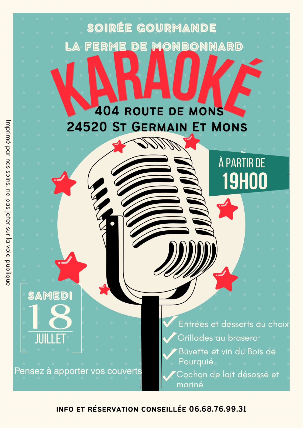 Événement spécial le 18 juillet : dégustation au brasero avec cochon de lait désossé et mariné, suivie d’une soirée karaoké festive !