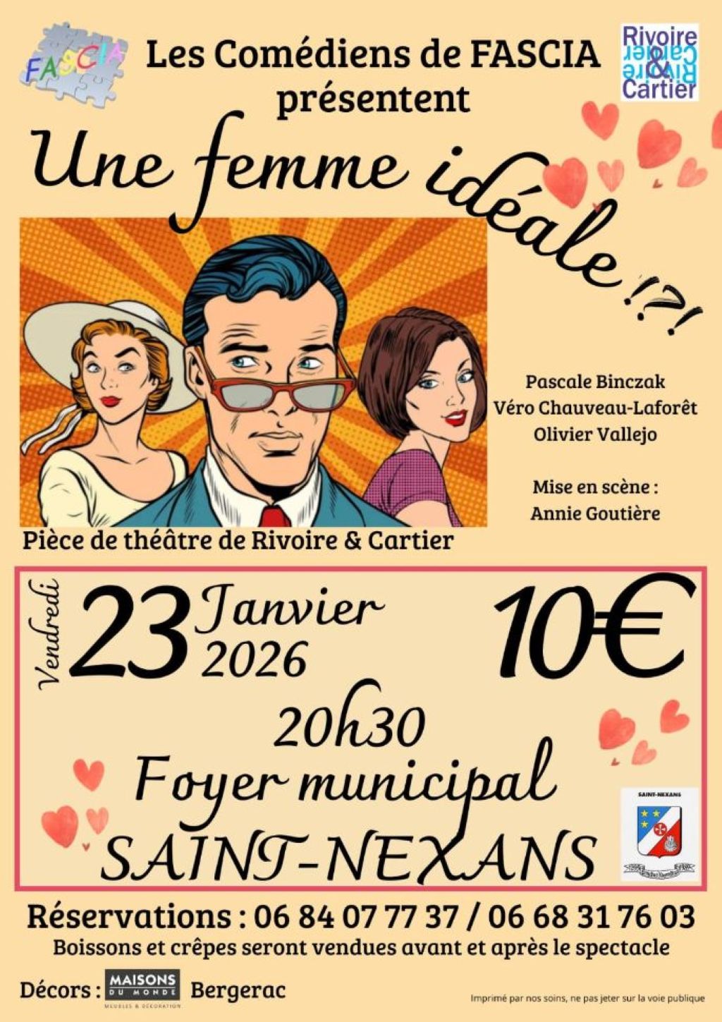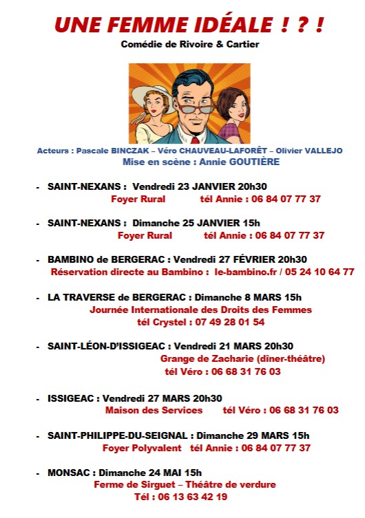 L'association Fascia de Saint-Nexans propose une nouvelle pièce de théâtre intitulée "Une femme idéale". Cette comédie sans entracte d'une heure et demie environ, en 1 seul acte et juste 3 comédiens, mélange le comique de situation et le comique de mœurs, vous permettant de rire franchement et intelligemment, dans laquelle les rebondissements éclatent jusqu’à la fin, ce qui vous tiendra en haleine tout au long du spectacle.