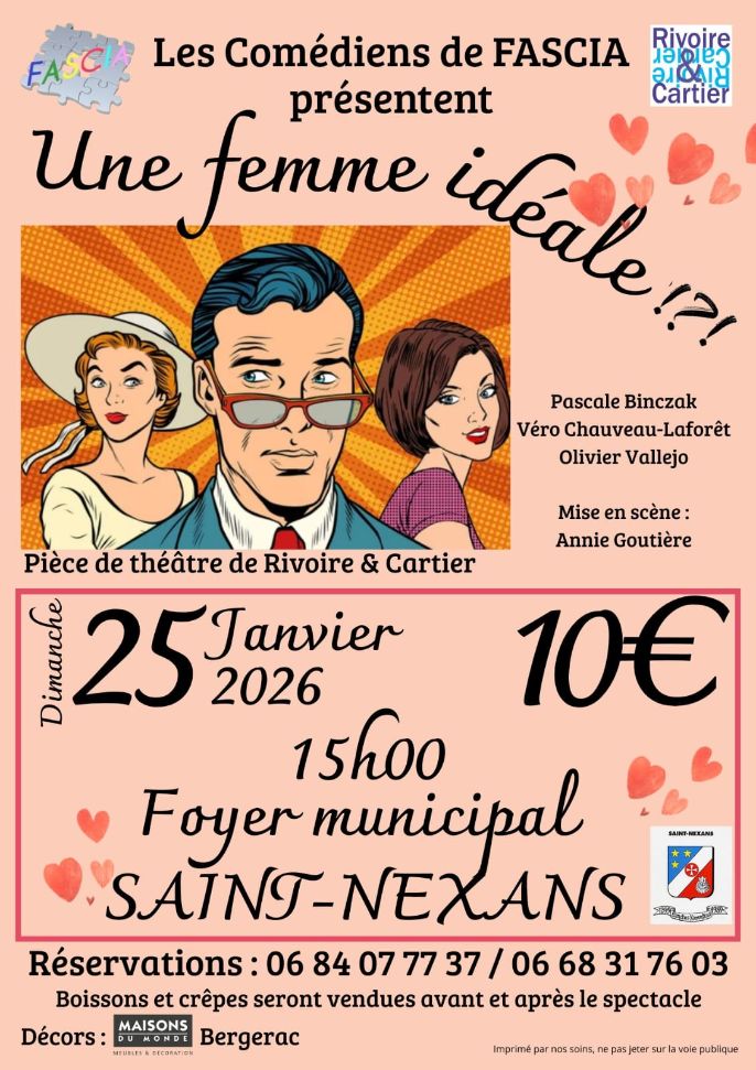 L'association Fascia de Saint-Nexans propose une nouvelle pièce de théâtre intitulée "Une femme idéale". Cette comédie sans entracte d'une heure et demie environ, en 1 seul acte et juste 3 comédiens, mélange le comique de situation et le comique de mœurs, vous permettant de rire franchement et intelligemment, dans laquelle les rebondissements éclatent jusqu’à la fin, ce qui vous tiendra en haleine tout au long du spectacle.