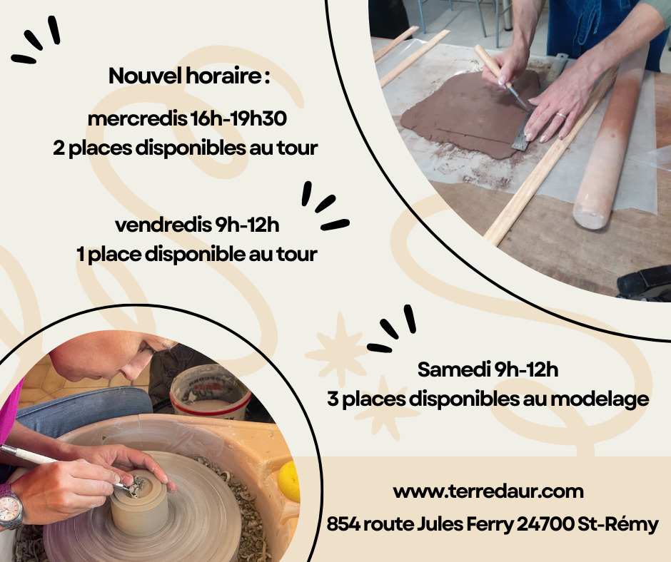 - Tarif de base : 60,00€ (Initiation au tour ou au modelage. Autres prestations et boutique sur site web.)