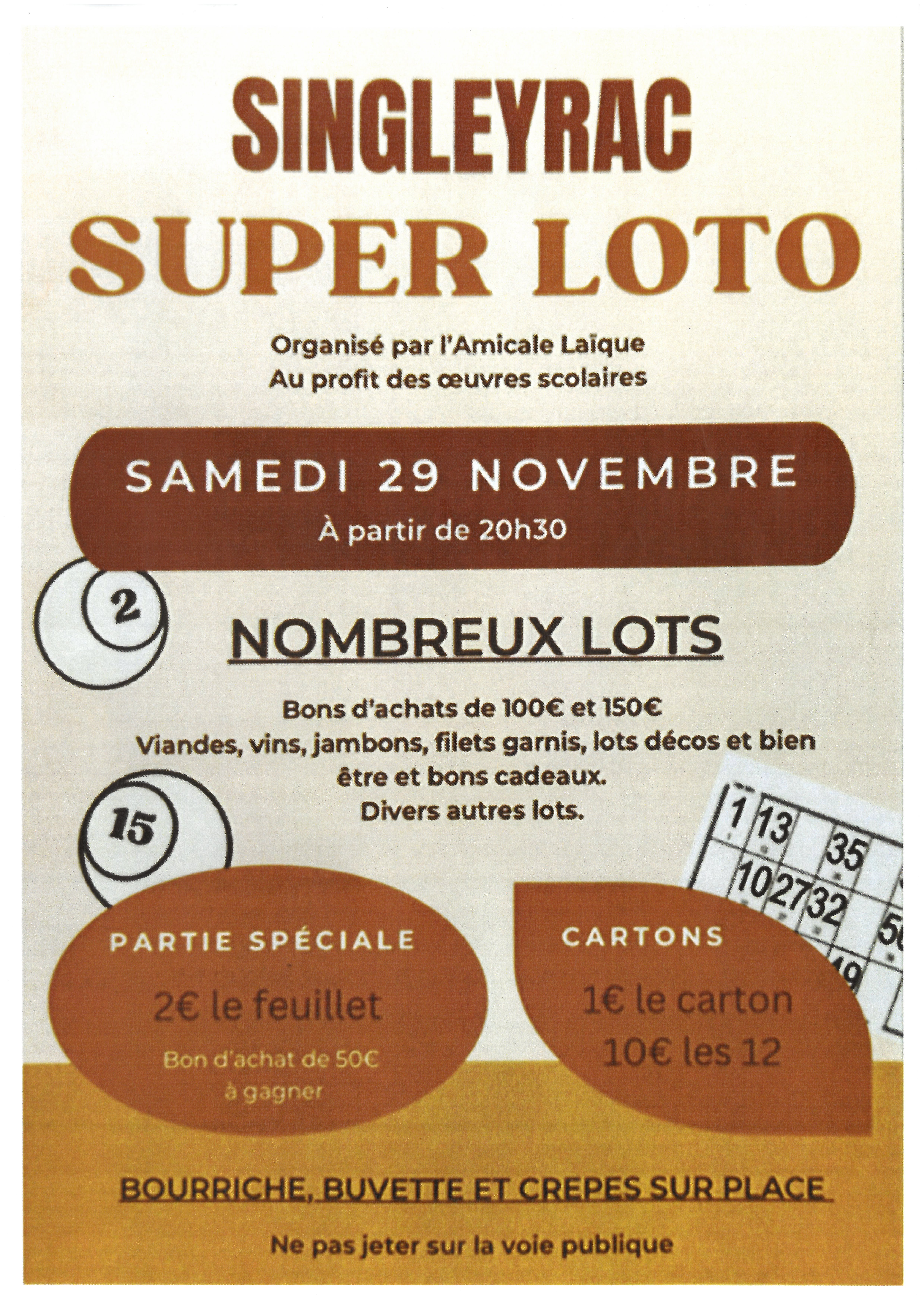 L'Amicale Laïque organise un super loto au profit des œuvres scolaires.