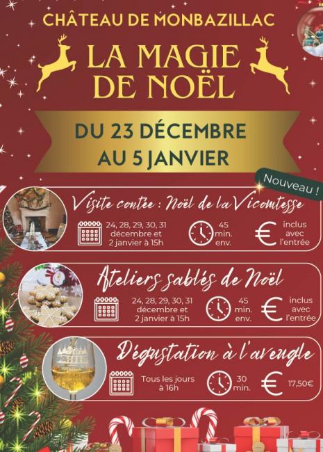 Le Château de Monbazillac vous invite à vivre une après-midi gourmande ! Les enfants pourront participer à des ateliers pour réaliser leurs sablés de Noël, tandis que les plus grands vivront une expérience ludique et surprenante avec une dégustation à l'aveugle de 3 vins. Pour couronner le tout, plongez au coeur du XVIIIème siècle avec la visite contée "La Vicontesse Marguerite de Bacalan et la légende du sapin" .