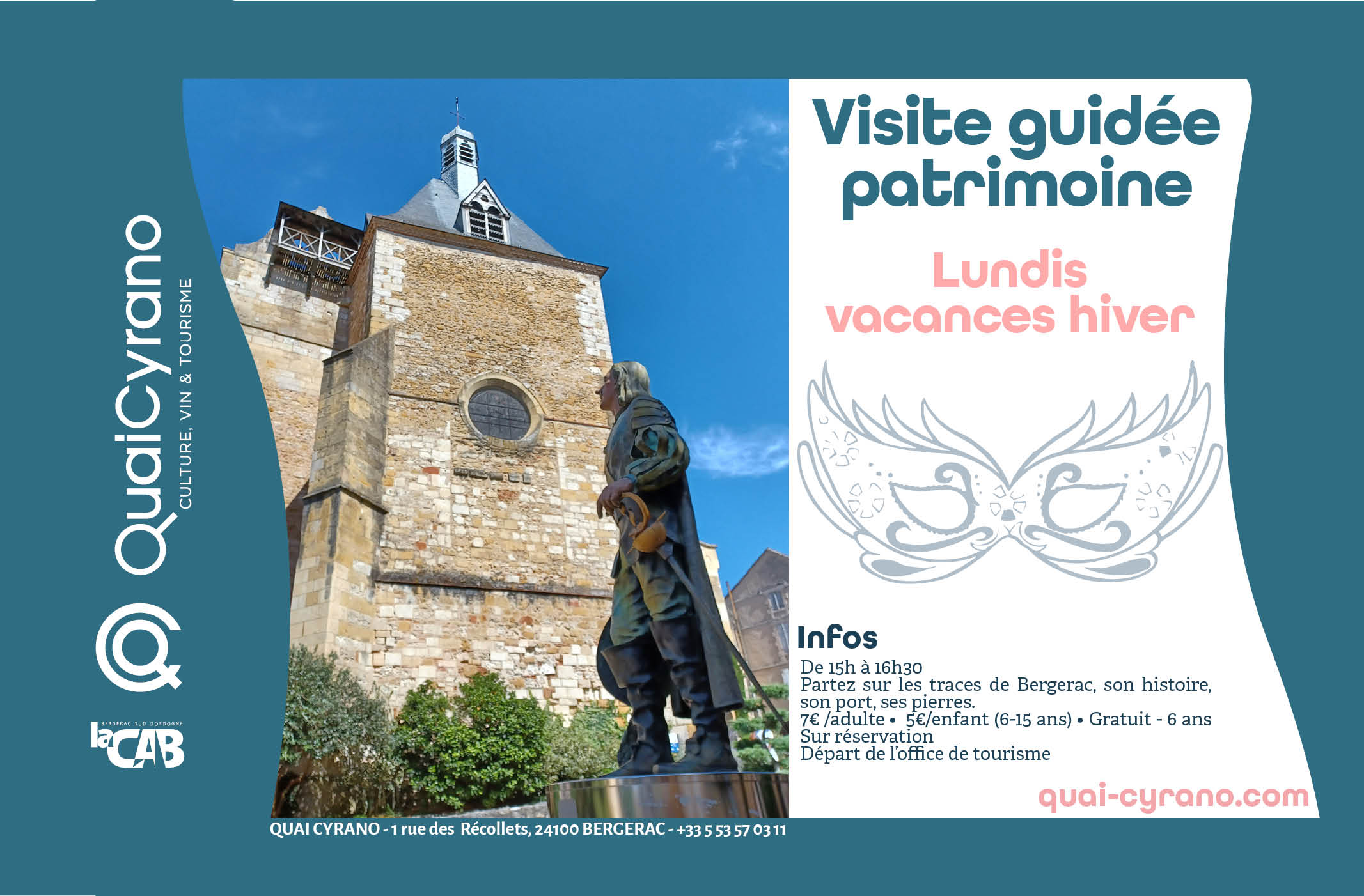 Quai Cyrano heeft ook een boekwinkel, een winkel met souvenirs en plaatselijke producten, en een kaartverkoopdienst voor rondleidingen en voorstellingen. U kunt ook profiteren van een echte showroom gewijd aan de eigenschappen van de Bergerac Duras wijnroute, een wijnbar, een prachtig terras met uitzicht op de Dordogne, en, als kers op de taart, de prachtige Cloître des Récollets.