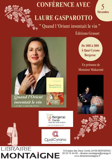 Quai Cyrano, avec la Librairie Montaigne et l’Interprofession des Vins de Bergerac et Duras (IVBD), est très heureux de vous inviter à un moment de partage autour du nouveau livre de Laure Gasparotto, Quand l’Orient inventait le Vin.