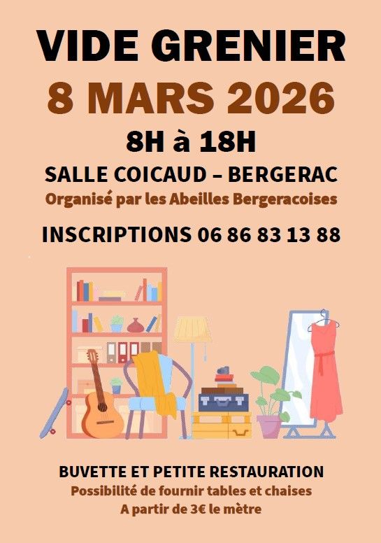 L'association Les Abeilles de Bergerac organise un vide grenier le 8 mars 2026, à la salle René Coicaud à Bergerac.