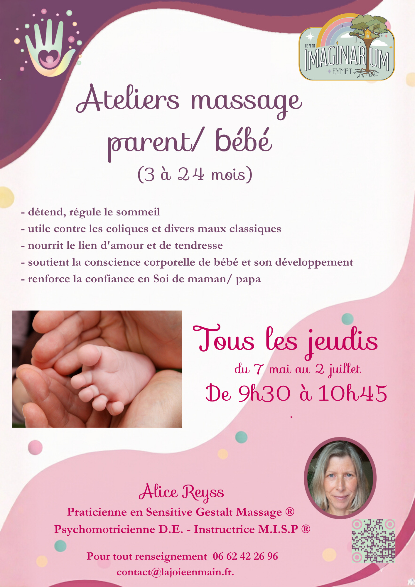 Alice Reyss, praticienne en Sensitive Gestalt Massage et psychomotricienne, vous propose un atelier de massage entre parent et bébé entre 3 et 24 mois.