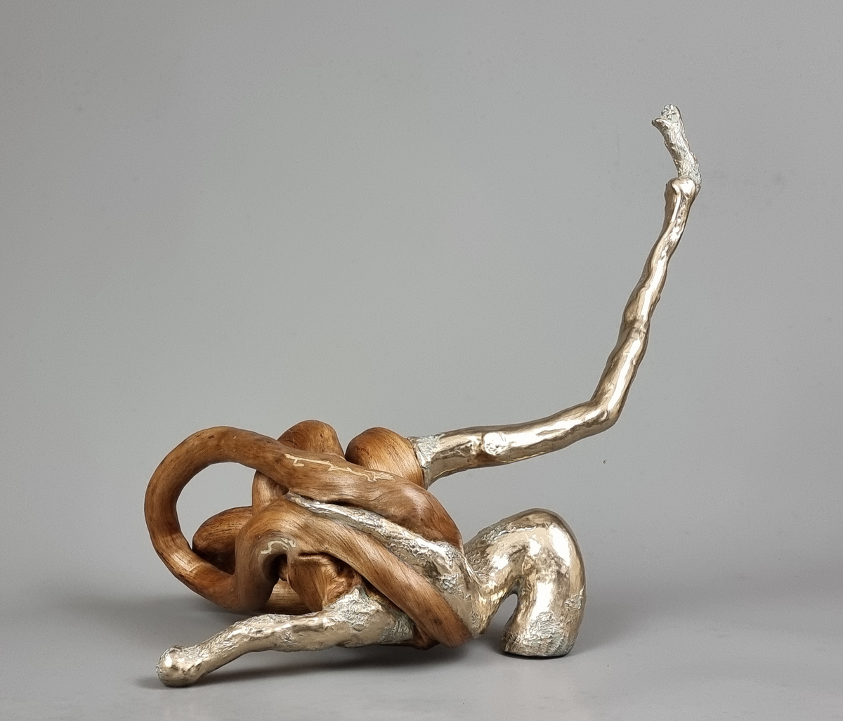 Les reflets de l’or se lovent au creux le plus intime, ou glissent à fleur de peau des branches brutes, écorces, troncs d’arbres, glanés avec émotion pour raconter, sublimer une blessure, révéler quelque secret de ces sculptures naturelles.