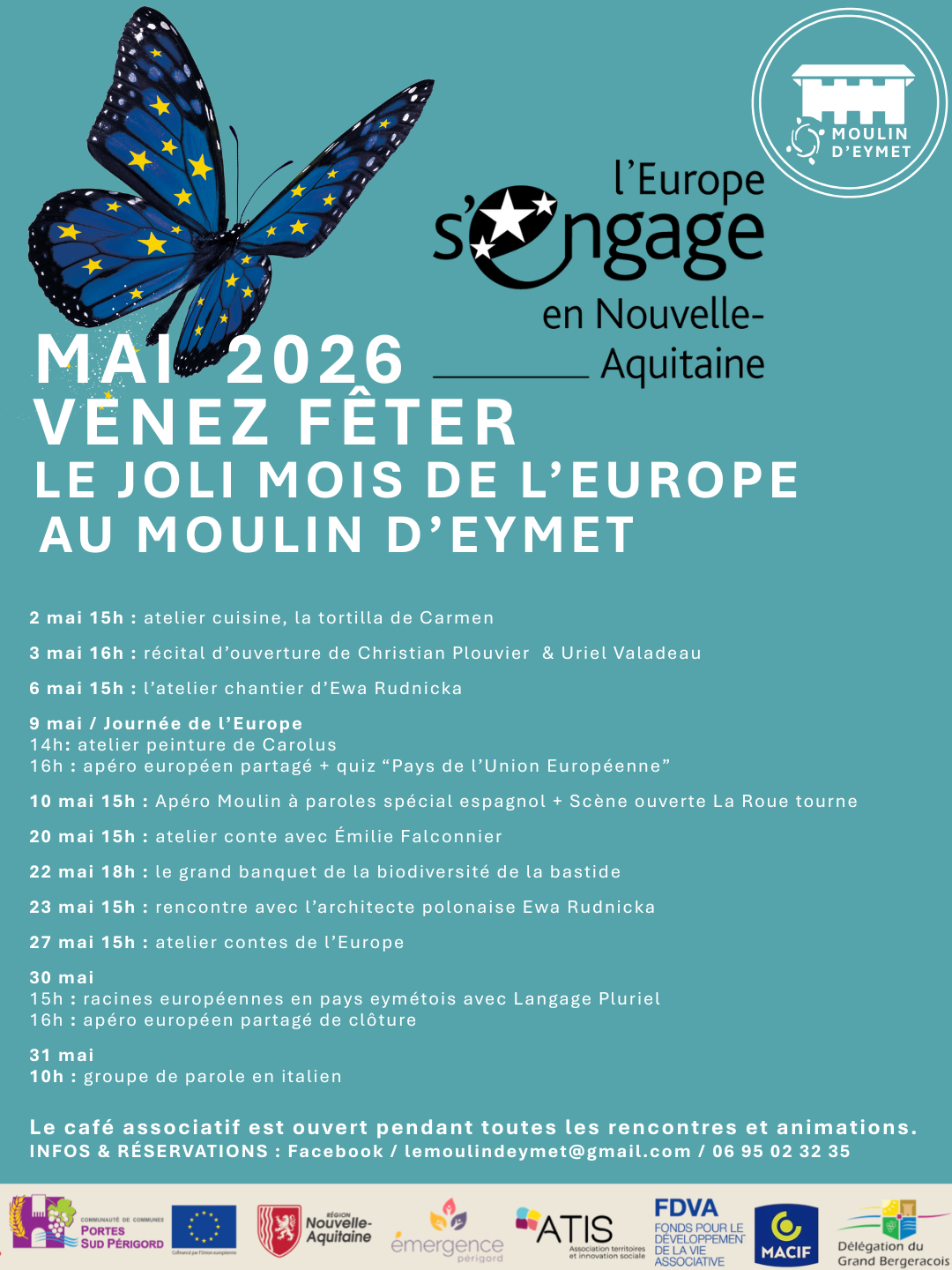 Tout au long du mois de mai, le Moulin d’Eymet célèbre le joli mois de l’Europe, un événement festif organisé depuis 18 ans. Il met en avant les valeurs européennes et les actions concrètes pour les citoyens, tout en présentant les projets soutenus par les fonds européens dans la région. Parmi ces initiatives, un tiers-lieu alimentaire créatif et écologique est en développement au moulin, avec le soutien de la Région Nouvelle Aquitaine et de l’Europe.