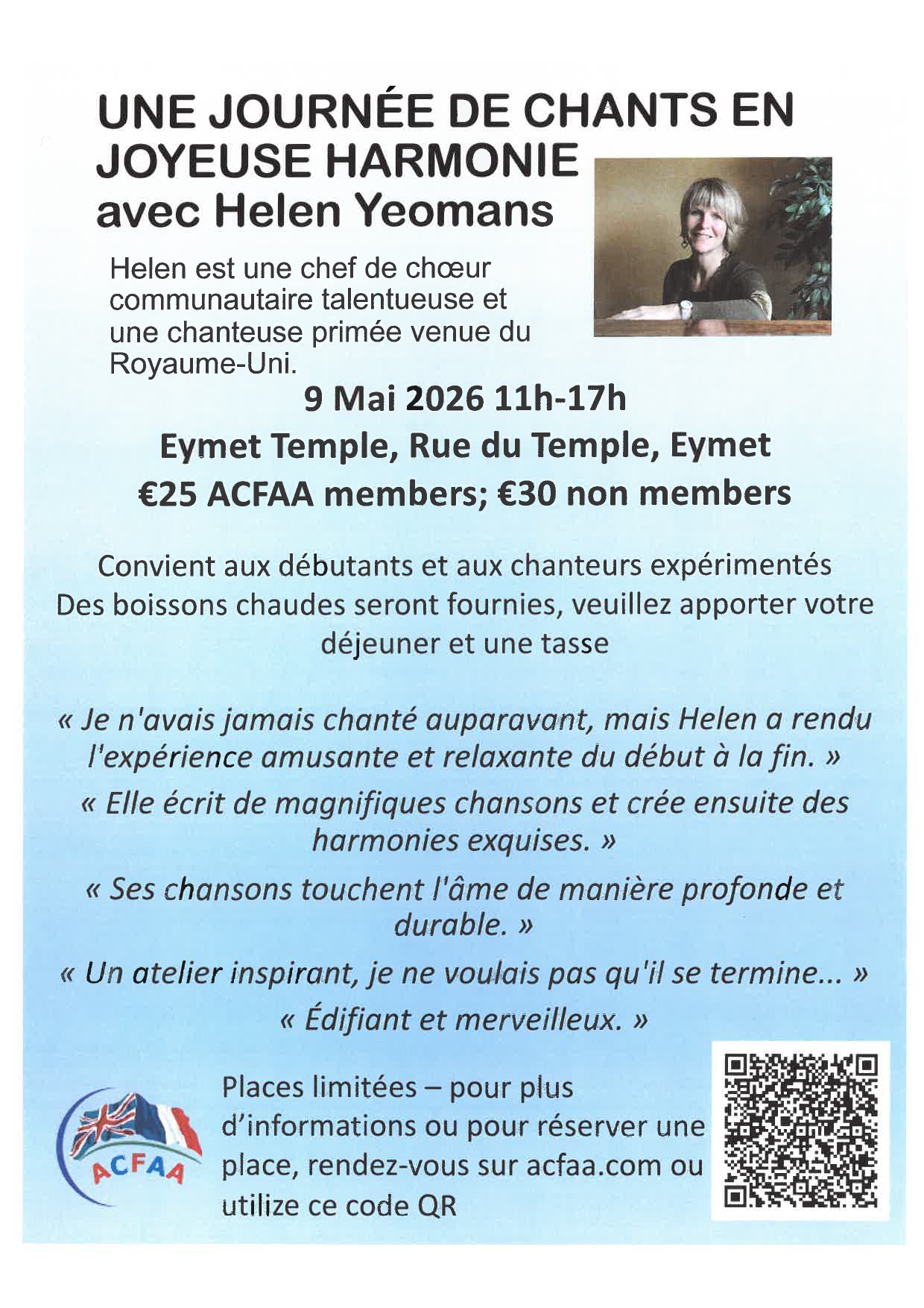 Une journée de chants en joyeuse harmonie avec Helen Yeomans, chef de chœur communautaire talentueuse et une chanteuse primée venue du Royaume-Uni.