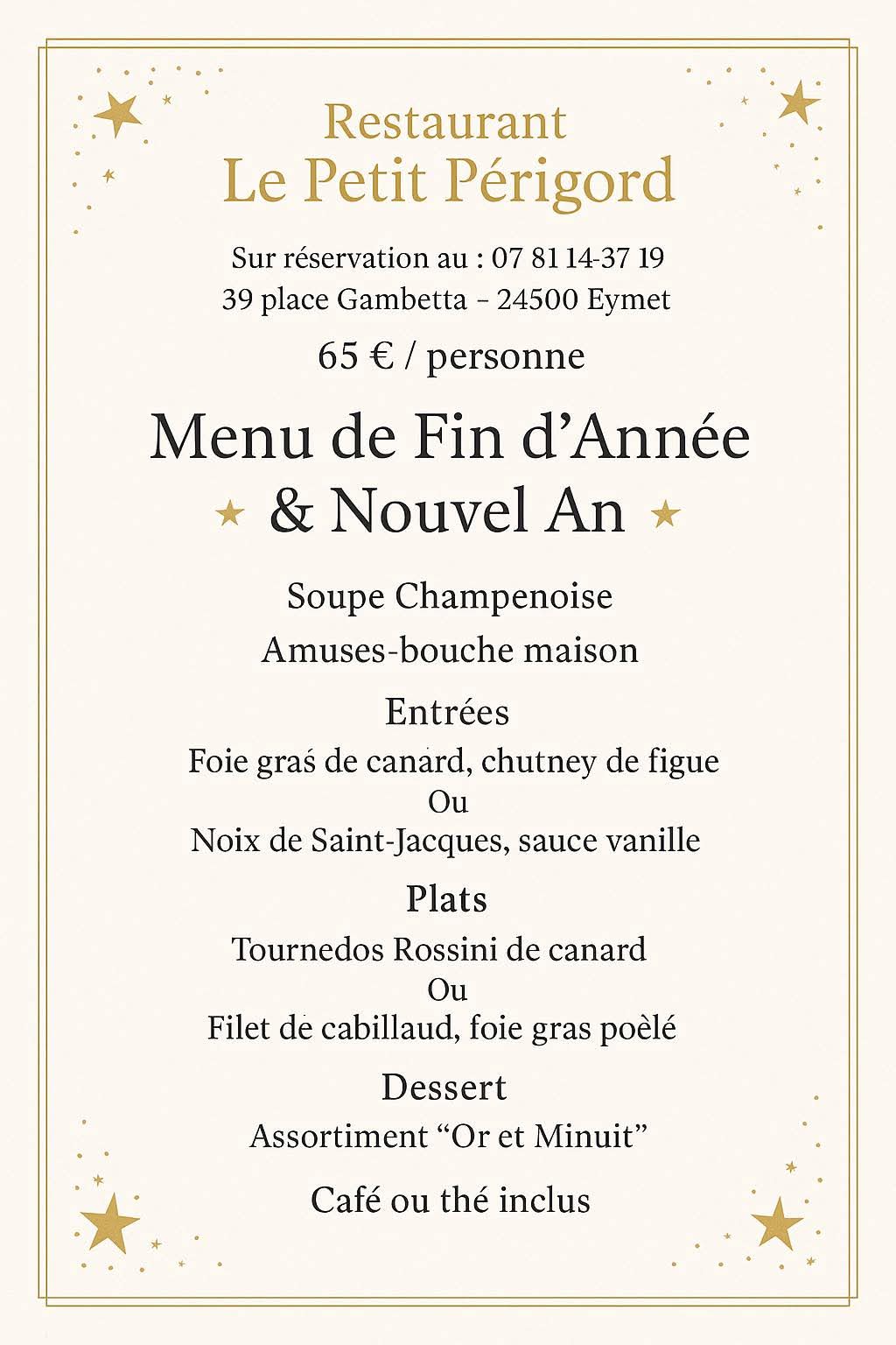 Le restaurant Le Petit Périgord vous propose un menu de réveillon pour les fêtes de fin d'année.