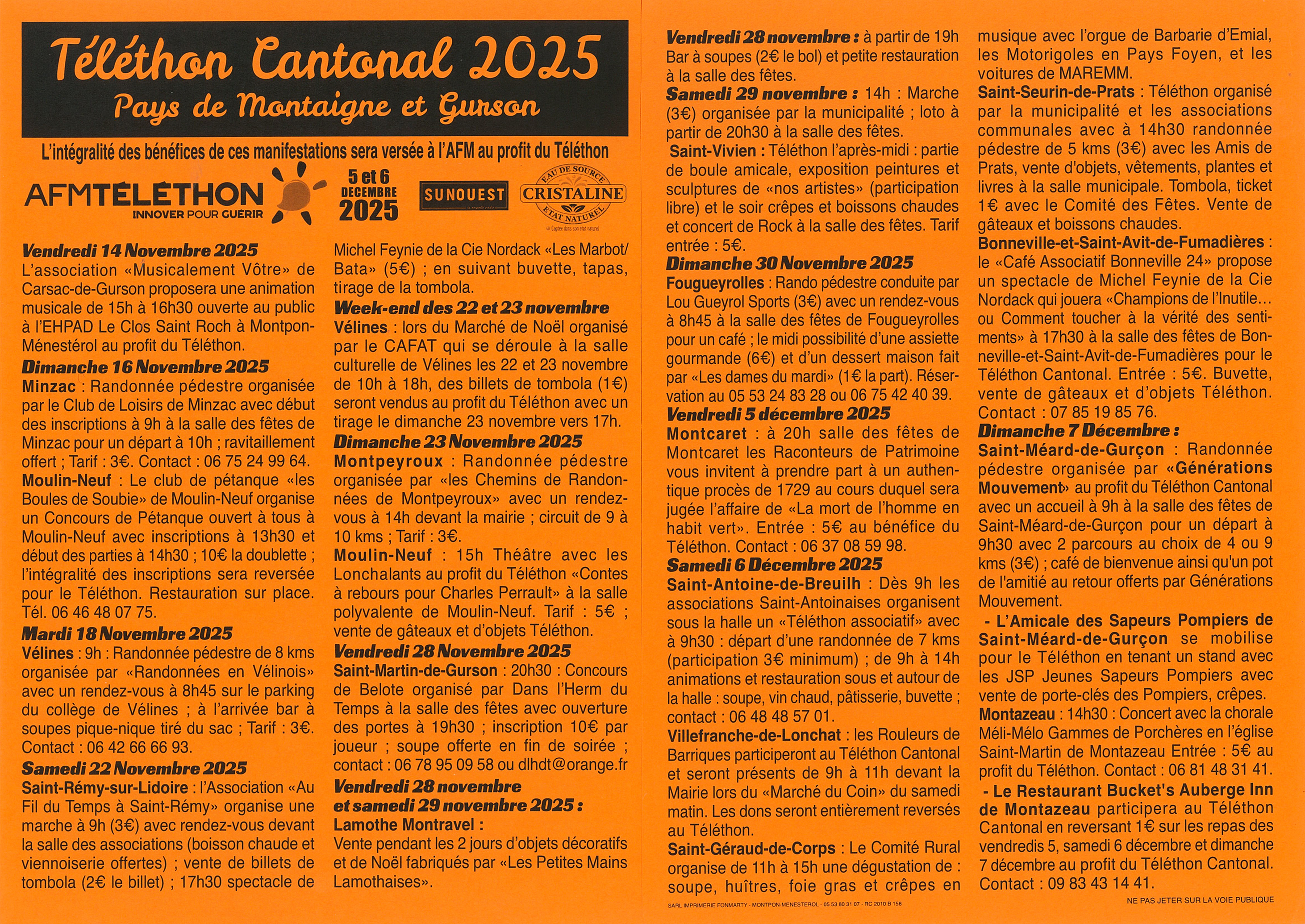 Les vendredis 5 samedi 6 et dimanche 7 décembre 1 euro reversé au Téléthon Cantonal Pays de Montaigne et Gurson 2025 sur les repas servis au Bucket’s Auberge Inn de Montazeau.