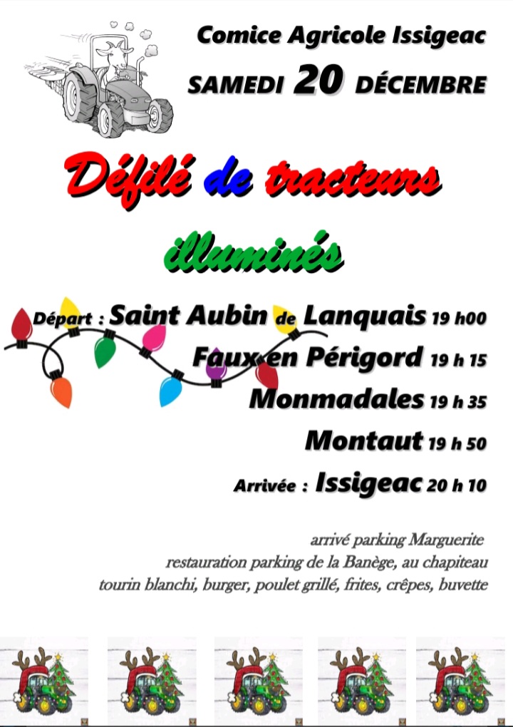 Cette année, le départ se fera depuis St-Aubin-de-Lanquais à 19h. Passage à Faux-en-Périgord 19h15 puis Monmadalès 19h35 et Montaut 19h50 pour arriver à Issigeac vers 20h10 où nous ferons le tour de ville avant de s’arrêter au parking Marguerite.