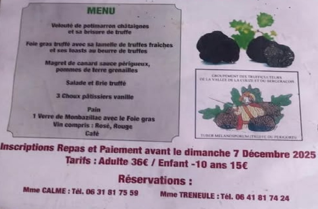 13h repas à la salle des fêtes : sur inscriptions avant le 7 décembre
