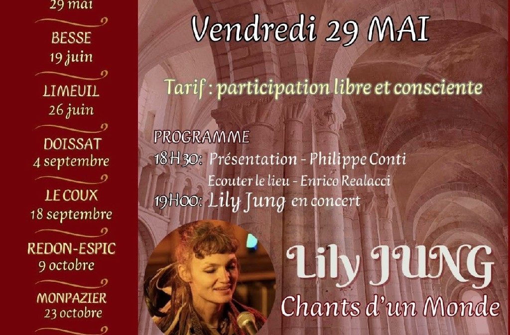 Au programme à 18h30, philippe Conti vous fera une présentation. Puis "Ecouter le lieu" de Enrico Realacci. A 19h00 ce sera le concert de Lily Jung. Chants d'un monde.